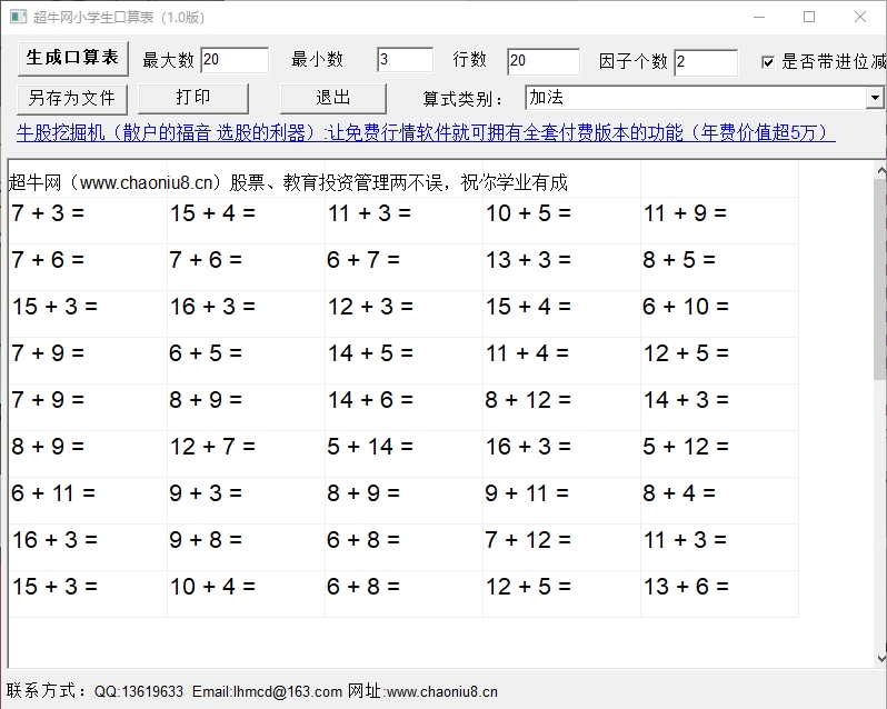 2、小学生口算题生成器支持自定义最大数、最小数、行数和因子个数等内容。