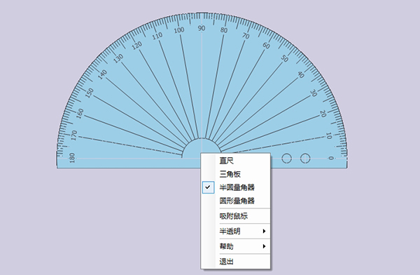 3、改变几何尺的形状在几何尺上点击右键,弹出右键菜单,如图 在右键菜单中选择“三角板”,几何尺会以三角板的形式显示,如图 选择半“圆量角器”,以量角器的形式显示,如图 此工具还提供了“圆形量角器”。