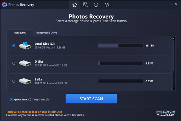 照片恢复提供两种特别的扫描模式来搜索丢失的照片。根据您的照片从电脑中删除的方式,选择快速扫描或深度扫描。