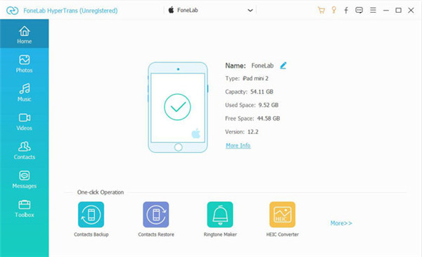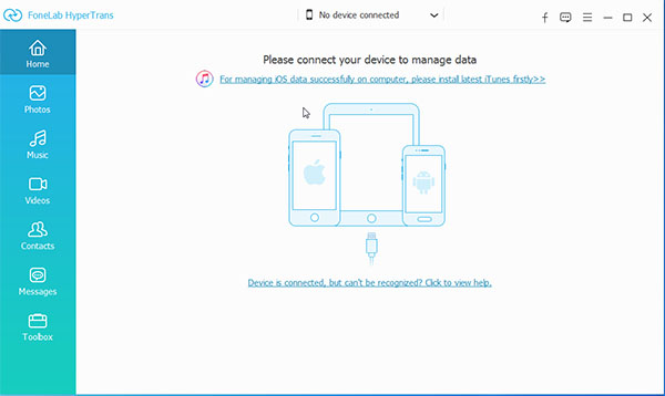 1、启动计划首先,您应该在计算机上下载并安装FoneLab HyperTrans 。然后启动它。连接您想要传输的来源或目标的设备。