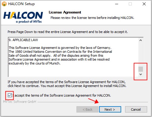 2、点击运行halcon-18.11.0.1-windows.exe开始安装,下滑侧栏,同意条款;