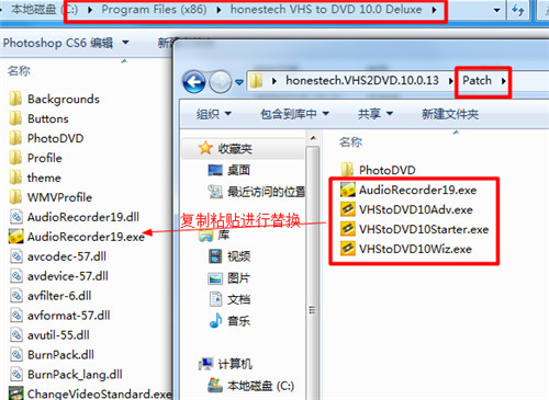 8、此时,将Patch夹中的“AudioRecorder19.exe”、“VHStoDVD10Adv.exe”“VHStoDVD10Starter.exe”以及“VHStoDVD10Wiz.exe”四个文件全部复制到安装目录下进行粘贴替换