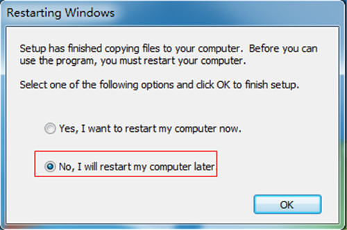 7、待安装成功后,会弹出如下图所示图框,点击“NO. I will restart my computer later.”即可