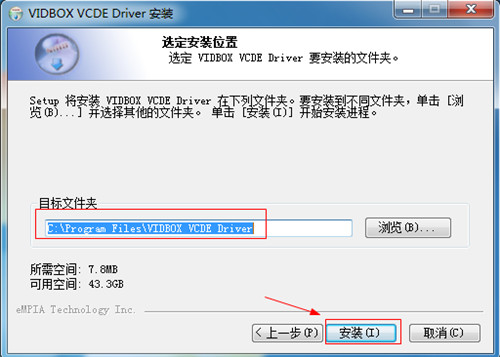 5、选择VIDBOX VCDE Driver软件安装路径,点击开始安装,同样依提示完成