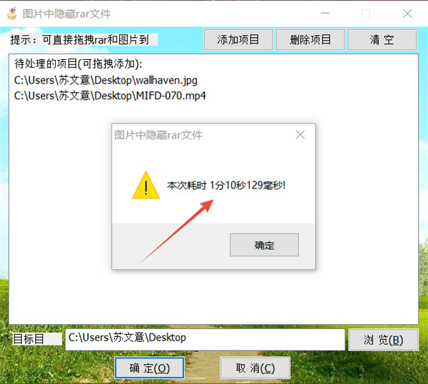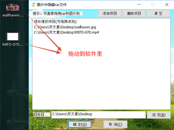 1、其中图片的格式为主流的jpg\png\bmp\gif四中格式,直接拖拽图片和需要隐藏的文件(夹),支持拖拽多个文件(夹),然后点击确定保存即可。