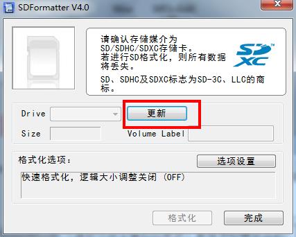 3、插入需要格式化的内存卡,完成之后进入程序,点击“更新”等待程序自动识别出该内存卡,目前该程序仅支持SD/SDHC/SDXC存储卡