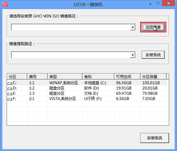 4、进入U行侠PE系统后,U行侠一键装机工具会自动启动,之后我们点击 “浏览镜像” 按钮,如下图所示: