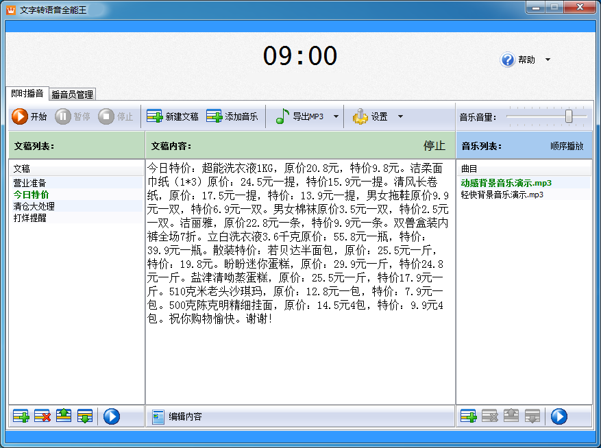 “文字转语音全能王”专为商家设计,同时具备文字播音和制作语音广告的功能。您只需把播音稿导入到软件,软件就可对您的文字播音稿进行自动循环播音,每天播音内容不一样时,您只需修改对应文字即可变更播音内容,使用十分方便。软件在进行文字播音的同时,还能自动播放背景音乐,使播音效果更佳。如您希望在音响上播放商品促销信息,您可以使用导出MP3的功能,将您的文字播音稿导出成带有背景音乐的语音广告MP3,随后您可以把它任意放到U盘或者手机上播放,自由度非常高。作为为数不多具备播音员研发能力的厂商之一,我们研发了具备自主知识产权的第五代真人级文字播音员,新款的播音员具备播音情感和播音风格调整,使得发音更为流畅、自然,媲美专业主持人,与此同时,新款播音员专为卖场播音而设计,发音更为洪亮,是传统朗读型播音员的两倍以上,可轻松应对嘈杂环境,再也不会出现促销内容听不清的尴尬局面。