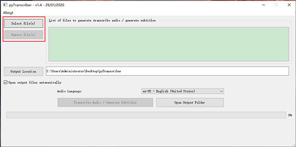 虽然目前该软件目前还不支持中文,但是不用太担心看不懂的问题,操作很简单。1、第一步点击左上角的Select File(S),选择你要转成字幕的影片。支援批次处理,也就是你可以一次选择多部影片,有选错的部分,就点一下该档案,然后点击左侧Remove File(S)移除。