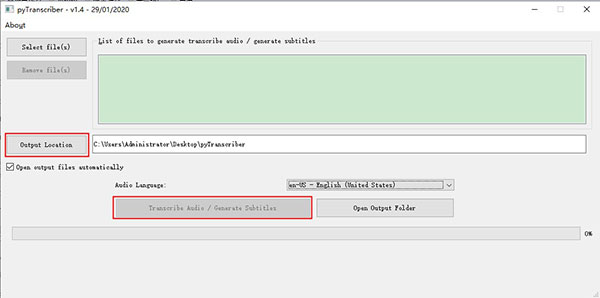 3、点击Output Location可以更换转转成字幕后储存的位置,预设为桌面的PyTranscriber资料夹。都好了之后,就点击下方Transcribe Audio/Generate Subtitles 开始转换:
