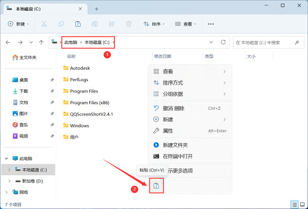 2、打开本地磁盘C,再右键文件夹的空白处,点击【粘贴按钮】。