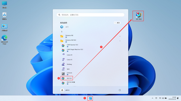 27、回到桌面,点击任务栏的【开始菜单】,在【所有应用】中找到【NX 10.0软件图标】,将软件图标拖到桌面上,完成软件桌面快捷方式的创建。