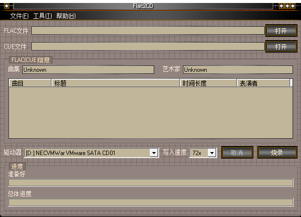 FLAC音乐CD映像(FLAC + CUE)文件是一种压缩格式,由一张音乐CD压缩而成,音乐CD里面的所曲子都被压缩到一个文件里面,使用Flac2CD将FLAC音乐CD映像(FLAC + CUE)文件刻录到CD后,所有CD上的曲子都是可寻轨的。