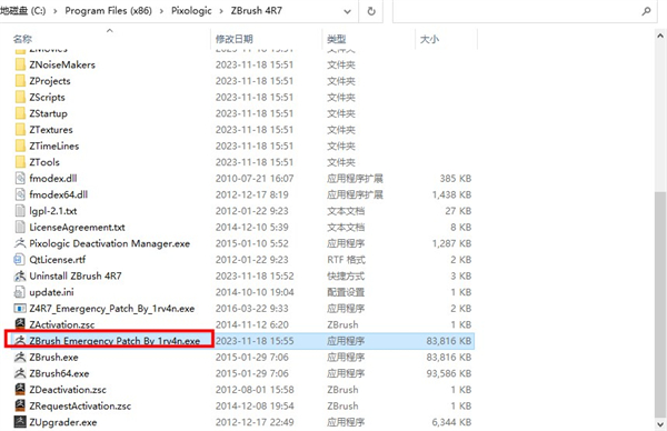 5、在默认安装路径当中右击【ZBrush Emergency Patch By 1rv4n.exe】