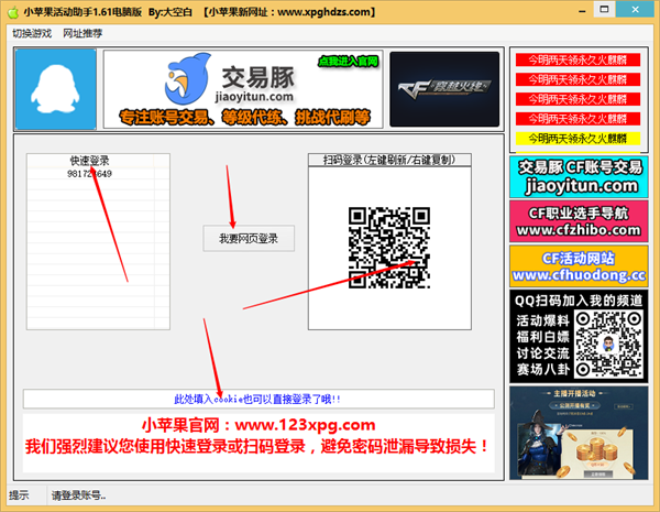 先进入活动网址,在活动网址里面的登录账号绑定游戏大区,然后再登录这个软件,如果登录不上,把安全中心退了,或者网页登录保护关了,就可以了!