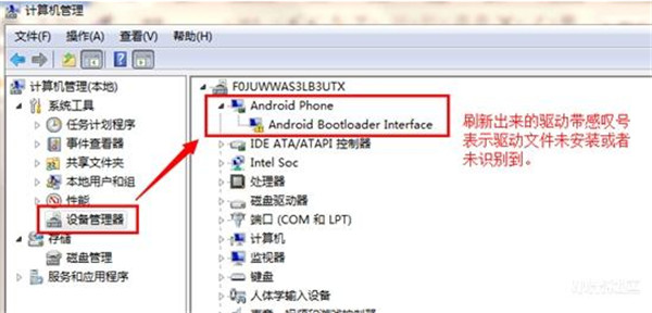 1、若刷新出来的驱动前面带感叹号,表示驱动未安装或者未识别到;