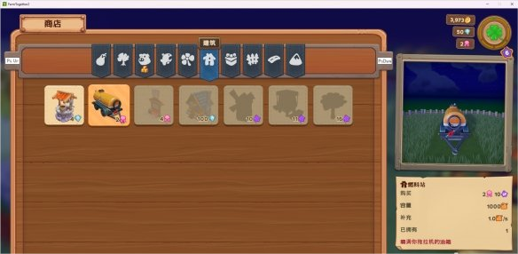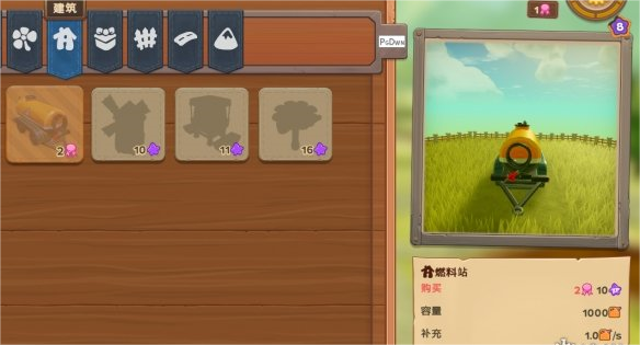 补充燃料可等它自己恢复,也可按Q键打开商店找到建筑一览,花费2奖章建造燃料站填满拖拉机。