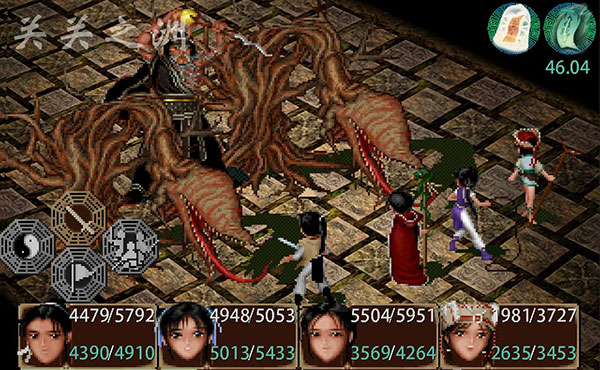 46、战后继续剧情,老树精没啥好说的,加好防御,最好不要硬抗魔掌天下,有可能一招下去血就空了。月如不在,我方战力急剧下降大画妖战,其实还挺简单的,阿奴法术使劲砸,莽过去就行,敌人血不多。