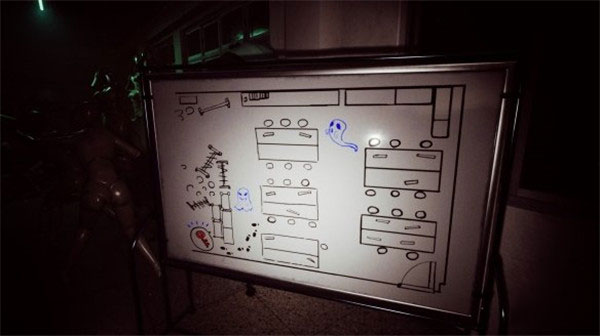 2、打开美容教室后门时遭遇人偶追杀,此时迅速躲藏至桌子底下,根据白板上的提示可知钥匙的藏匿地点。