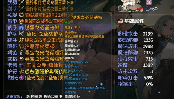 裤子选择苍蓝法裤:提供元素伤害加成,适合至圣斩的神圣伤害。