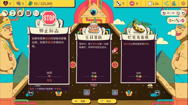 3、每一次射出球,你可以组件3选1(都不满意可以reroll,次数有限)且每一次通过关卡,你也可以3选1抽取被动能力。比如让有挂件的球在边缘会丢掉挂件折返,所以随着关卡推进,你的“弹射”能力会越来越变态。