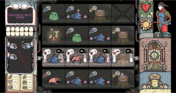 3、在游戏中右侧代表你需要在图中十六方格中击杀怪物收集的紫色球。每个方格中有怪物和钱币及回血道具,怪物都有显示击杀后可获取的球数,每击杀一个方格后都会被封锁;左侧可以用钱币购买各种道具。
