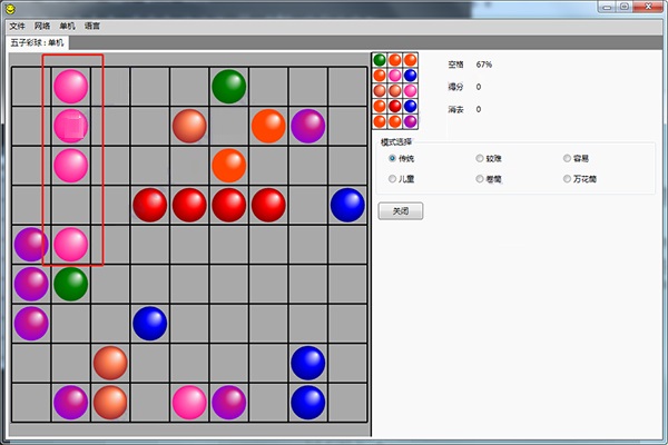五子彩球连连看电脑版是一款很好玩的休闲益智类游戏。相信很多小伙伴都有玩过这款游戏,它可以很好的帮助用户消磨时间,在空闲时快速来一把,开发智力,提升玩家的反应能力。在游戏中,玩家可以体验多种不同颜色的彩球,每局游戏开始的时候,都会随机摆放位置,玩家每次移动彩球都会随机出现三个彩球,在这个过程中,需要将同样颜色的球链接起来5个就可以消除了,玩法十分有趣,小编是玩不了几次就塞满了,喜欢这类游戏的玩家可以来本站下载该游戏体验一下吧。超级好玩,各种游戏玩法。传统、较难、容易、儿童、卷筒、万花筒等模式,下文中还有简单的玩法教程,大家可以下载这款游戏直接解压无需安装体验一下吧。