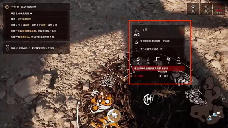 9、在游戏的一开始,玩家能够指挥的军团上限是5个,在第一章完全够用,但是如果想要指挥更多的军团可以通过蚁巢的扩军来扩充军团的生产上限以及指挥上限。