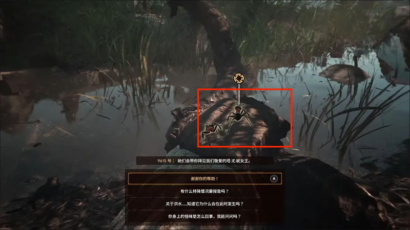 2、在树干上有一只小蚂蚁——9615号,它告诉我们女王塔尤在等待主角的觐见,在9615号这里我们还可以得到另一个消息就是塔尤岗即将遭受洪水,紧接着继续往前就到了塔尤女王的巢穴。