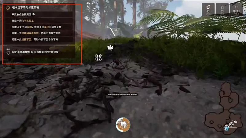 6、这几个任务可以一个一个完成,首先向地图枫叶标的地方前进,这里是一个红蝽的巢穴,只要打下来再生产一批劳工,就可以完成第一个任务。