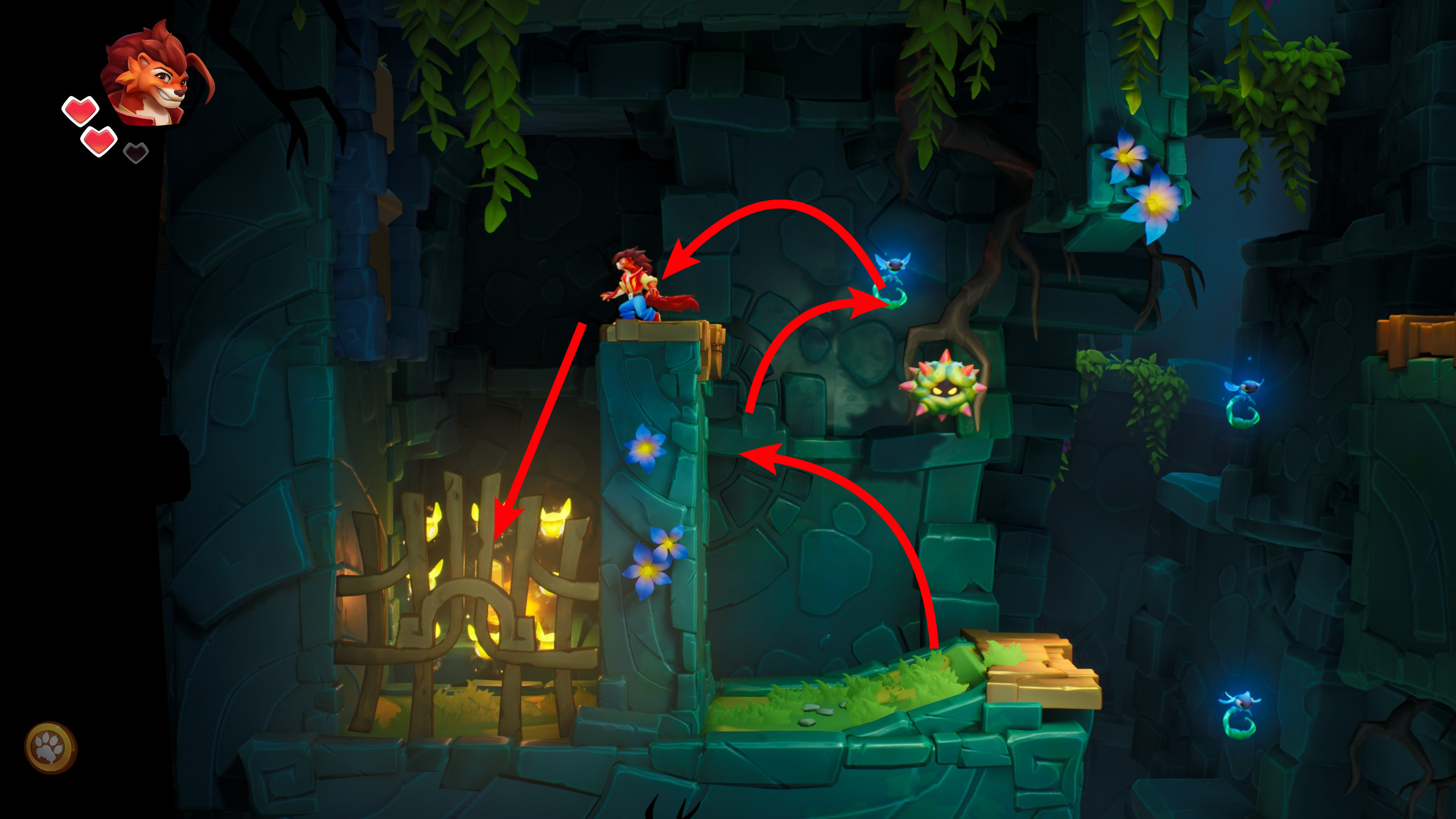 15、通过墙壁踢和环状昆虫到达I面板。小心漂浮的海胆!