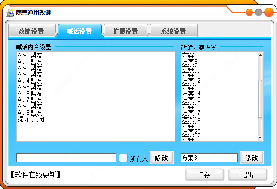 魔兽改键器是一款针对“魔兽争霸”游戏的一个辅助改建工具,说明白一点就是将魔兽争霸3原人物技能的按键位置进行修改,其在dota中被广泛使用,它使得玩家能够更加流畅的使用技能。同时除了普通的修改按键位置功能外,魔兽改键器还提供了魔兽显血、自定义改键、内存改键、自动启动浩方平台、vs平台和qq平台等功能,让你能够一键即可用处多个技能,而且这样就可以完美的避免键盘会有冲突,让你的键盘直接变成智能宏,让你的游戏体验达到更佳!而魔兽争霸3是美国的暴雪娱乐制作的一款即时战略题材单机游戏,玩家可以选择在游戏中操控四个种族,其中人类(Human)和兽人(Orc)在其前作《魔兽争霸2黑潮》中就已出现,另外两个是新增的种族,即暗夜精灵 (NightElf)和不死亡灵(Undead)。