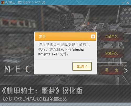 注意:下载和安装汉化时,请关闭一切杀软以及360!1、在本站下载“机甲骑士:噩梦汉化补丁”,先可以解压到任意文件夹;