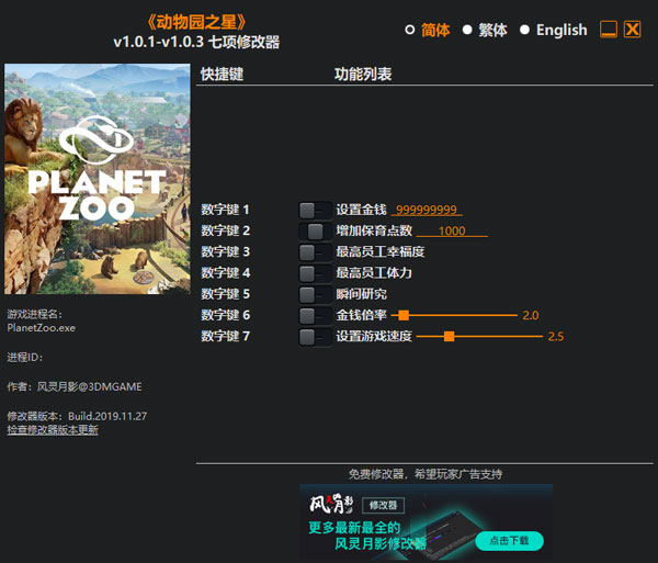 数字键 1 - 设置金钱数字键 2 - 增加保育点数