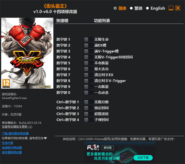 街头霸王5冠军版修改器是一款专为动作格斗游戏《街头霸王5冠军版》所打造的多功能修改器,它提供无限生命、满EX槽、无限V-Trigger持续时间、不会眩晕、最大连击等十四项修改功能,让玩家在游戏中能够随意的击败对手,体验不一样的游戏乐趣!