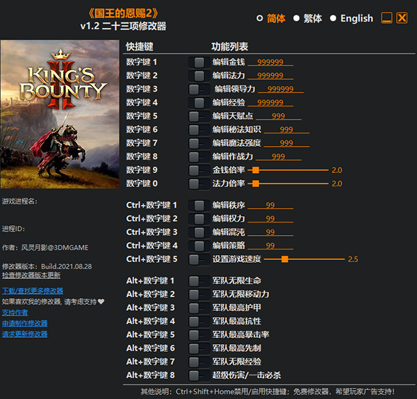 国王的恩赐2修改器是一款专为大型回合制策略游戏《国王的恩赐2》所打造的多功能修改器,修改器界面简洁明了,使用方便快捷,玩家只需启动游戏打开修改器即可,玩家可根据自身的需求进行修改属性,利用该修改器玩家可以修改金钱、法力、经验、天赋点、权力等二十三功能,帮助你更好的畅玩游戏!