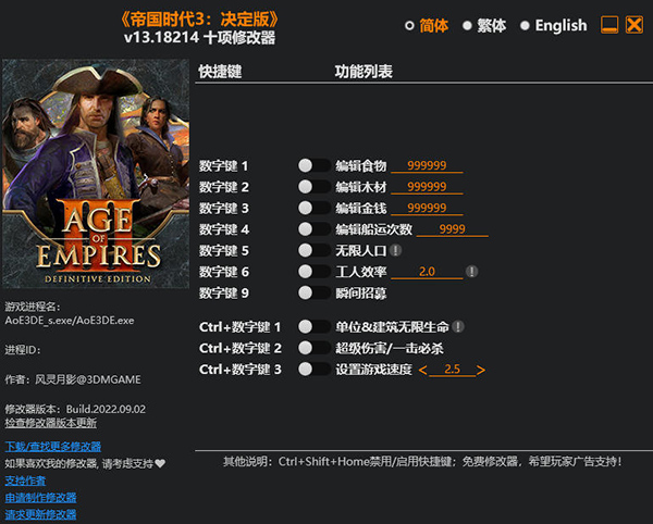 帝国时代3决定版修改器是一款专为《帝国时代3:决定版》电脑游戏所打造的多功能修改器,其中包括:编辑食物、编辑木材、无限人口、瞬间招募等多项修改功能,可让你更快上手游戏,提升游戏乐趣。有需要玩家欢迎下载使用。