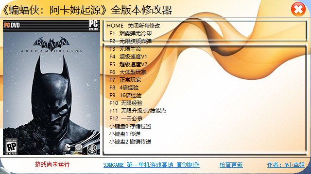 玩《蝙蝠侠:阿卡姆起源》时,如果觉得刷资源太累或者战斗太难,这个修改器简直就是“开挂神器”。它能让你瞬间拥有无限生命和道具,直接跟BOSS硬刚都不怕,省去了大量重复刷级的时间,特别适合只想体验剧情或者想轻松通关的玩家。我个人觉得最实用的功能是无限技能点和一击必杀,能让你快速解锁所有招式,打起来爽快感十足。而且操作特别傻瓜式,下载解压后一键启动,配合F键就能实现各种修改,比如烟雾弹无冷却或者超级跑图。不过得提醒一句,用修改器虽然爽,但可能会降低游戏原本的挑战乐趣,建议先通关原版再开挂玩,这样既能享受剧情又能体验“为所欲为”的快感。小键盘的传送功能也很贴心,跑图省时省力,整体来说是个值得收藏的辅助工具。 使用说明 1、首先下载修改器并进行解压 2、运行修改器 3、运行游戏 4、使用热键修改游戏 热键说明 HOME 关闭所有修改 F1 烟雾弹无冷却 F2 无限胶质炸弹 F3 无限生命 F4 超级速度V1 F5 超级速度V2 F6 大体型玩家 F7 正常玩家 F8 4倍经验 F9 16倍经验 F10 无限经验(一次加10W) F11 无限升级点/技能点 F12 一击必杀 小键盘0 存储位置 小键盘1 传送 小键盘2 撤销传送