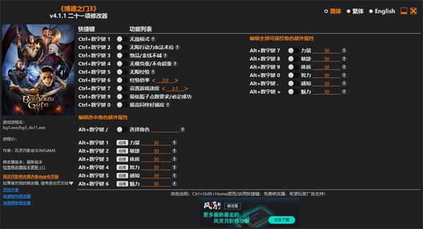 博德之门3修改器按键介绍