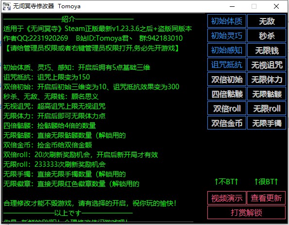 1、先开游戏,再开修改器。(请给管理员权限或者右键管理员权限打开)2、了解修改器使用说明。