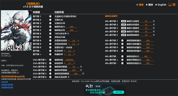 无限机兵修改器是一款专为《无限机兵》电脑游戏推出的强力辅助工具,通过它能实现无限生命、自由调整角色属性与抗性,快速获取各类资源,无敌模式、一击必杀、100%掉落等三十项战斗强化功能。此外,无限机兵修改器还能调节移动速度和游戏节奏,大幅提升游戏体验。总之,这款修改器可让你随心所欲定制游戏难度,无论是挑战高难还是享受割草快感都能完美满足。