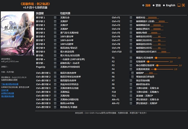英雄传说创之轨迹修改器是专门针对游戏《英雄传说创之轨迹》制作的辅助工具。修改器使用简单,启动游戏后玩家可以根据自身的需求进行修改属性,比如修改无限生命、EP、CP、DEF、ADF等多项功能,帮助你获得更好的畅玩游戏,但小编还是建议玩家们适度修改,以免丢失游戏体验。