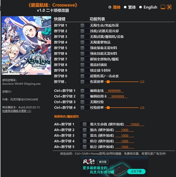 数字键 1 - 无限生命/免疫伤害数字键 2 - 技能/武器无需冷却