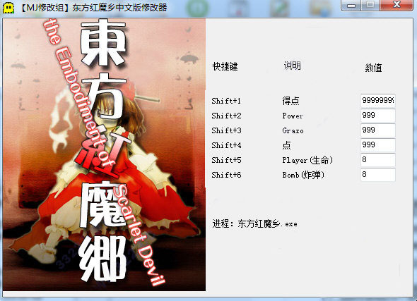 玩过东方红魔乡的都知道,这游戏弹幕密得让人头皮发麻,博丽灵梦在红魔馆里躲子弹简直是对手残党的终极考验。虽然官方难度确实硬核,但这款自带六项功能的修改器简直是救命稻草,尤其是时间停止和无敌这两个功能,手残党也能在红魔馆横着走。不过说实话,用修改器通关虽然爽,但建议新手先自己打几关体验原版弹幕的压迫感,等被妖梦的剑幕虐得怀疑人生时再开无敌也不迟。修改器里锁定player和bomb的功能特别贴心,再也不用担心残机不够用,但power修改建议慎用,毕竟弹幕火力全开时那种满屏特效才是弹幕射击游戏的精髓啊!东方红魔乡是一款难度极高的弹幕射击游戏,同时也是东方Project系列游戏中的第六款作品。游戏 背景设定在幻想乡,主角是博丽灵梦,她发现幻想乡的红魔馆变得异常活跃并出现了许多妖怪,所以决定深入到红魔馆中解决这个问题。玩家需要控制灵梦在各个关卡中与各种敌人进行战斗,躲避弹幕攻击并击败关卡末尾的boss角色。 困难但令人上瘾,为此本站为大家带来了东方红魔乡修改器,这是针对同名游戏而制作的一款游戏辅助工具,具备6项修改功能,包括时间停止、显示修改锁定rank、无敌、修改player、修改bomb和修改power,功能虽然简单,但非常的实用,可帮助玩家快速通关,又不会失去游戏乐趣,非常赞。 使用方法 进入游戏后,打开修改器,再按相应的热键修改即可。 主要功能 1、时间停止(快捷键C) 2、显示修改锁定rank 3、无敌(快捷键A) 4、修改锁定player 5、修改锁定bomb 6、修改锁定power