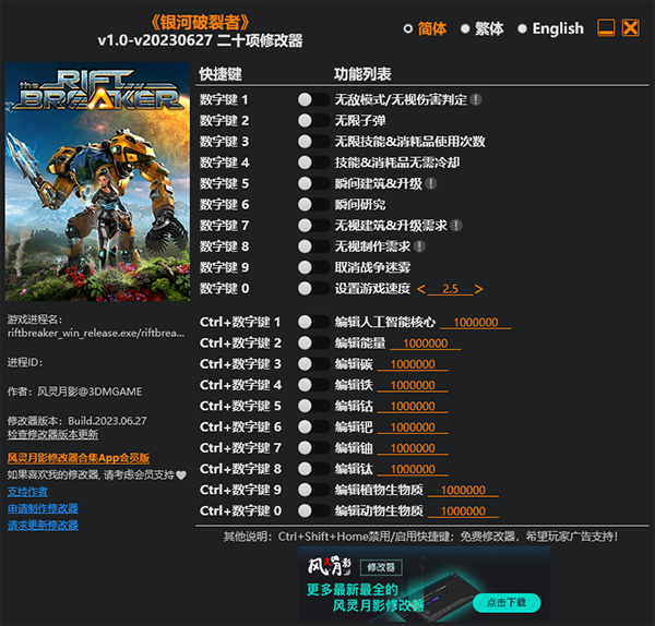 裂缝破坏者是一款内含动作RPG元素的基地建造类生存游戏,又叫银河破裂者,游戏采用了虚幻4引擎系统打造,画质和建模都非一般的细腻,将充满科技的外太空氛围很好的衬托出来了。游戏还有着战役模式、生存模式和沙盒模式共三个游戏模式可供玩家随意体验,喜欢创造和建造的玩家可以选择沙盒模式,在此模式中没有任何的危险可以安心的建造,喜欢挑战的玩家可以考虑体验生存模式和战役模式,在生存模式中,玩家需要收集各种各样的资源,而且还有时刻的提防外星生物的攻击,但是想要玩好这款游戏,难度还是有的,为此小编给大家带来了裂缝破坏者修改器,玩家通过这款修改器能够修改游戏中的多项属性,比如无敌模式/无视伤害判定、无限子弹、无限技能、消耗品使用次数、无视制作需求等等二十项修改功能,大大提升玩家们的游戏体验,喜欢的小伙伴千万不要错过哦!