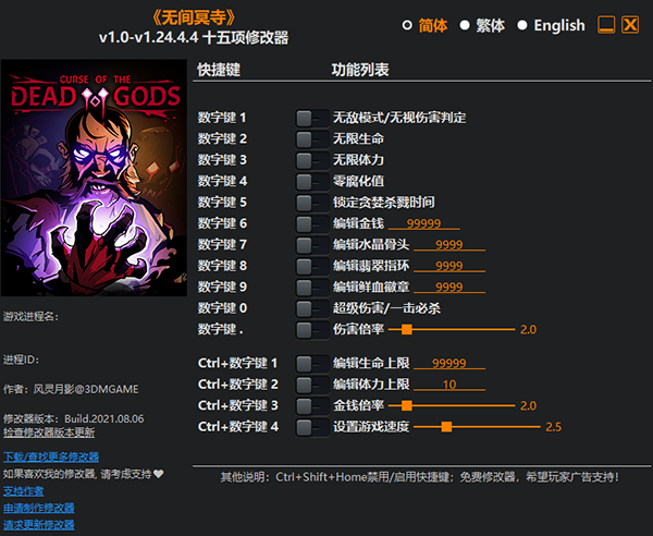 无间冥寺修改器是一款专为《无间冥寺》游戏所打造的多功能修改器,它提供无敌模式、无视伤害判定、无限生命、无限体力、零腐化值、锁定贪婪杀戮时间、编辑金钱等等修改功能,可全方位满足玩家们的使用需求。并且,修改器也简单易用,玩家只需启动游戏,运行修改器,按照修改器上方的功能按键操作即可在游戏当中享受修改功能的设定!