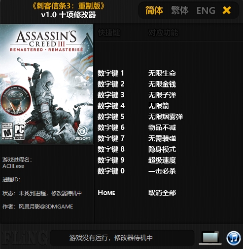 刺客信条3重制版修改器是一款针对动作冒险游戏《刺客信条3重制版》而研发的实用辅助工具,该软件使用方便,功能强大,内置简体,繁体和英文三种语言,拥有无限生命、无限金钱、无限子弹、无限烟雾弹、隐身模式、一击必杀等十项功能,能够帮助玩家在游戏中更好的完成任务!