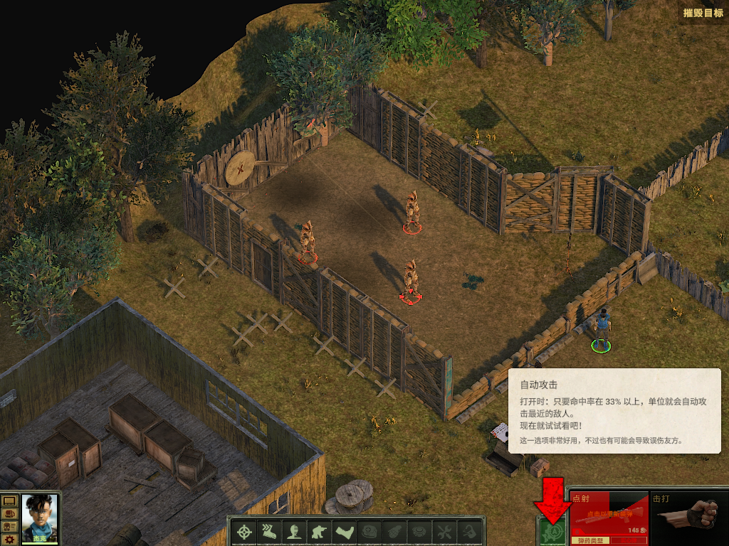 4、将鼠标放置目标身上可以看到命中率,鼠标左键射击,屏幕游戏右下角点击“靶子”标识,可以自动射击,可能会射击队友,所以需要密集场景慎用。