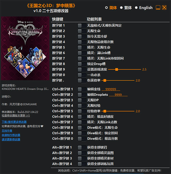 3、接着就是运行王国之心3D梦中陨落二十五项修改器,按照上面的按键功能,就是相对应的功能;
