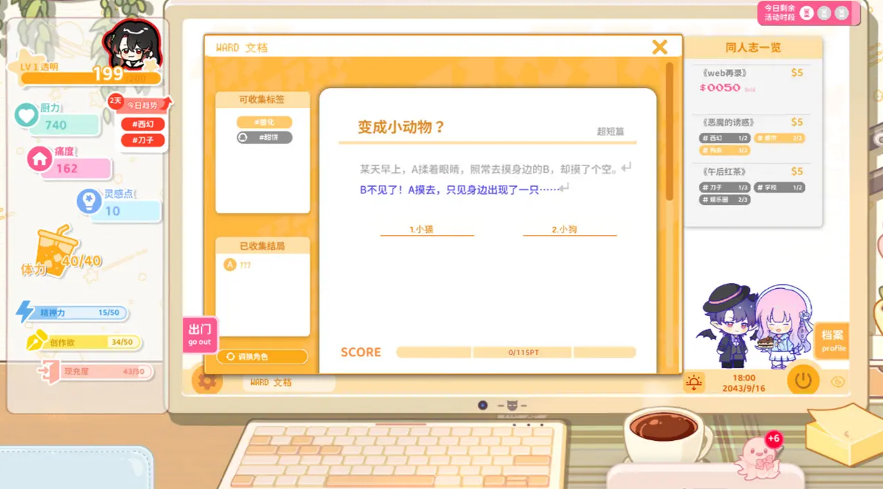 - 创作同人文:这是游戏核心,根据委托要求构思创作同人文,提升文笔等级可提高创作得分,通过特定地点活动能提升文笔。